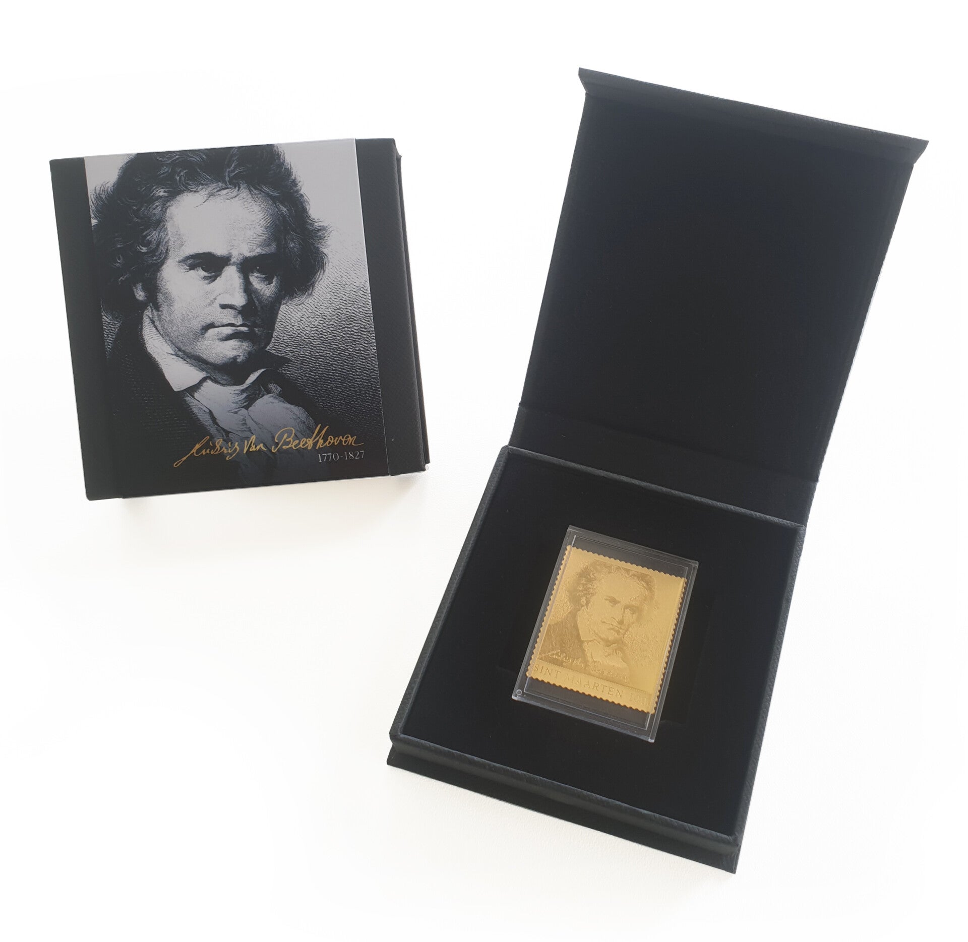 This stamp is made of 24-carat gold and was issued on the occasion of Beethoven's 250th birthday. The stamp was issued by PSS, the postal service of St Martin and the circulation is only 500 copies. This special gold stamp comes in a luxurious gift box.