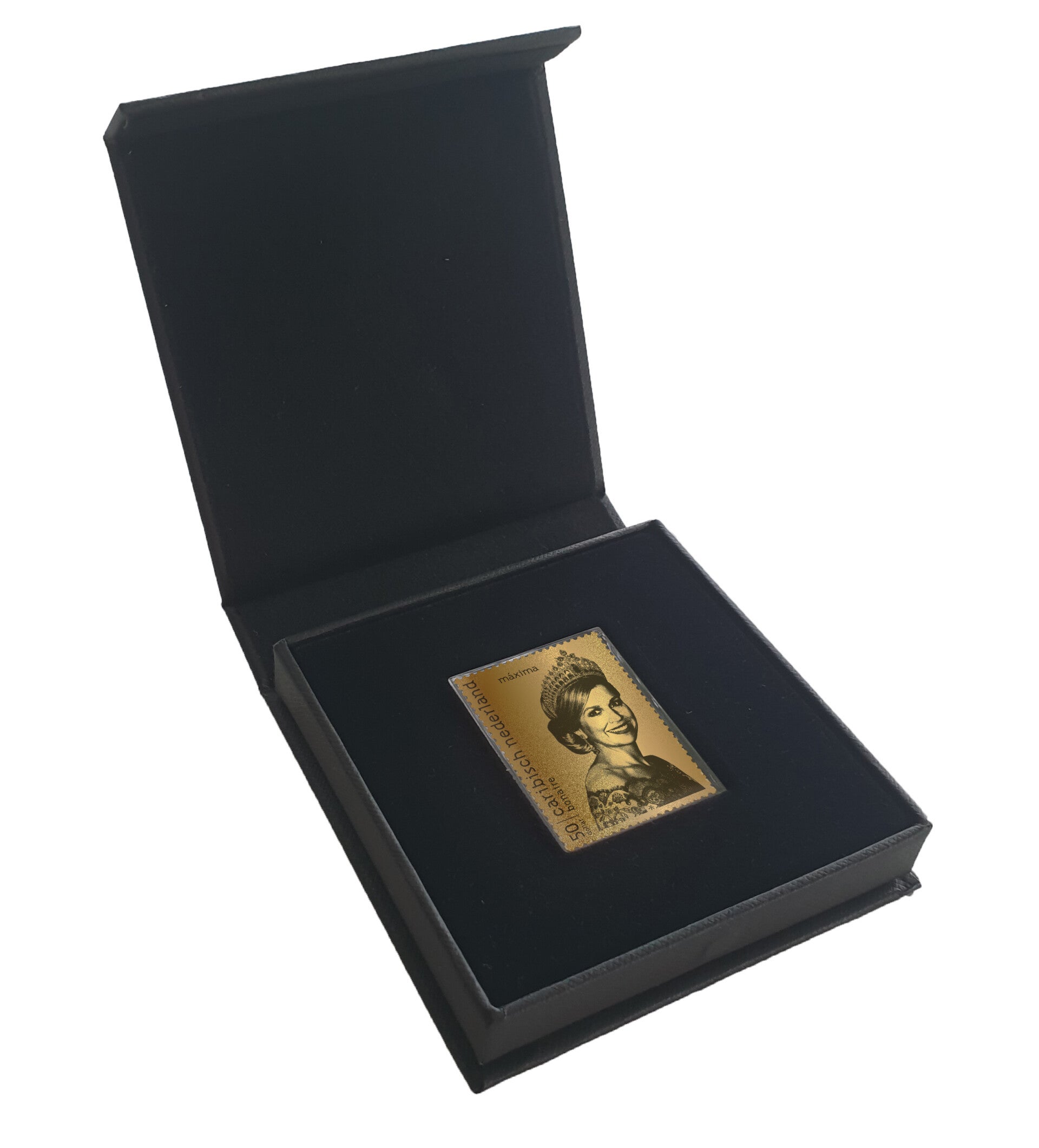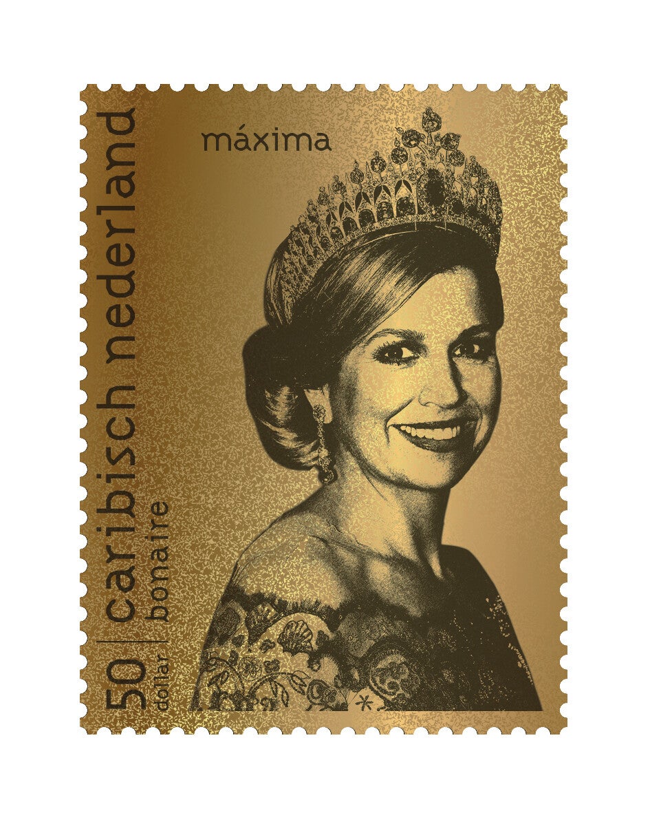 Deze postzegel is gemaakt van 24-karaats goud en is ter gelegenheid van de 50ste verjaardag van Máxima verschenen. De postzegel is uitgegeven door FXDC Post, de postdienst van Caribisch Nederland, en de oplage is slechts 500 exemplaren. Deze bijzondere gouden postzegel wordt geleverd in een luxe cadeaubox.